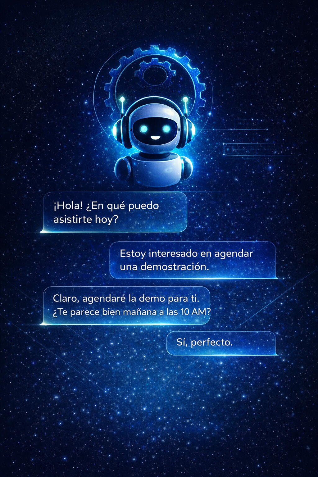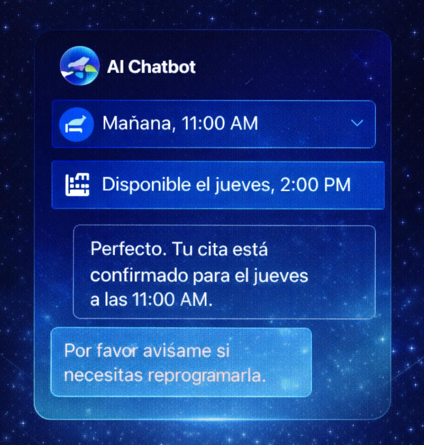 Responde preguntas, recopila información de contacto, califica prospectos y agenda citas automáticamente. En lugar de perder tráfico fuera del horario laboral, lo conviertes en oportunidades de negocio reales.